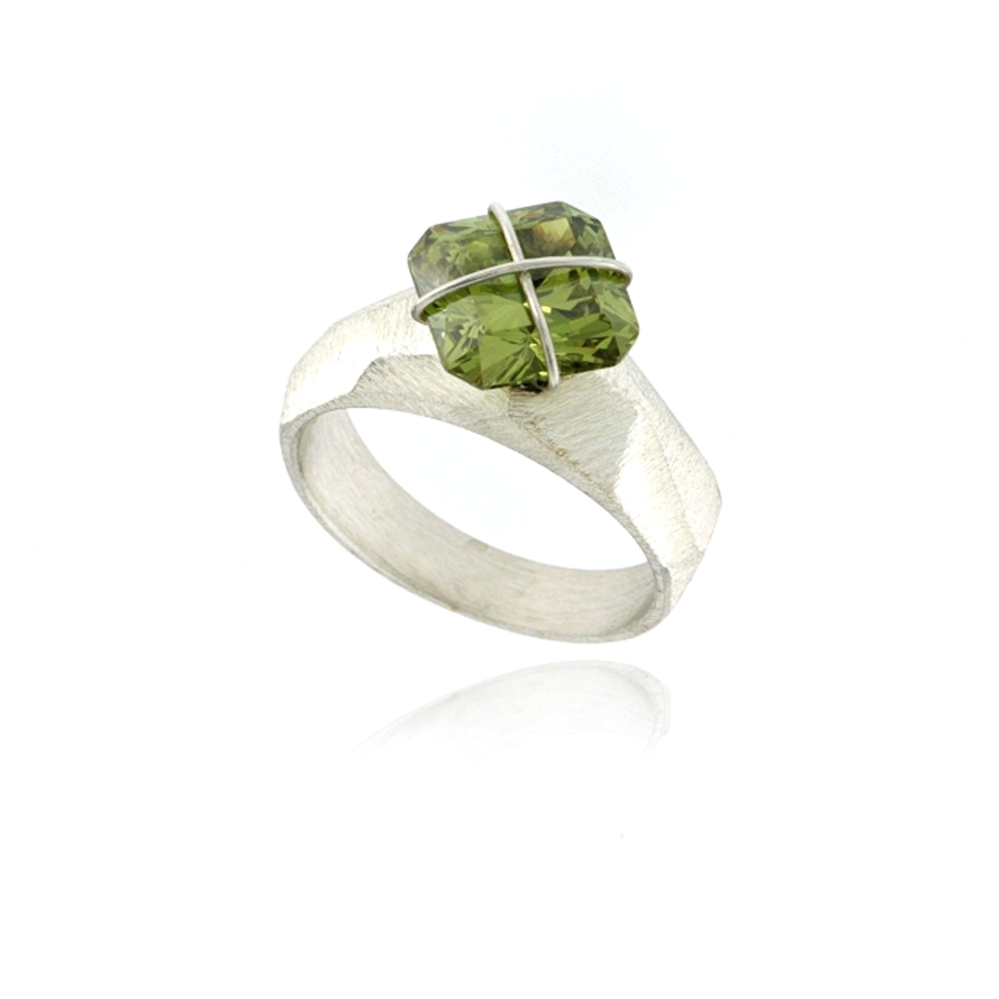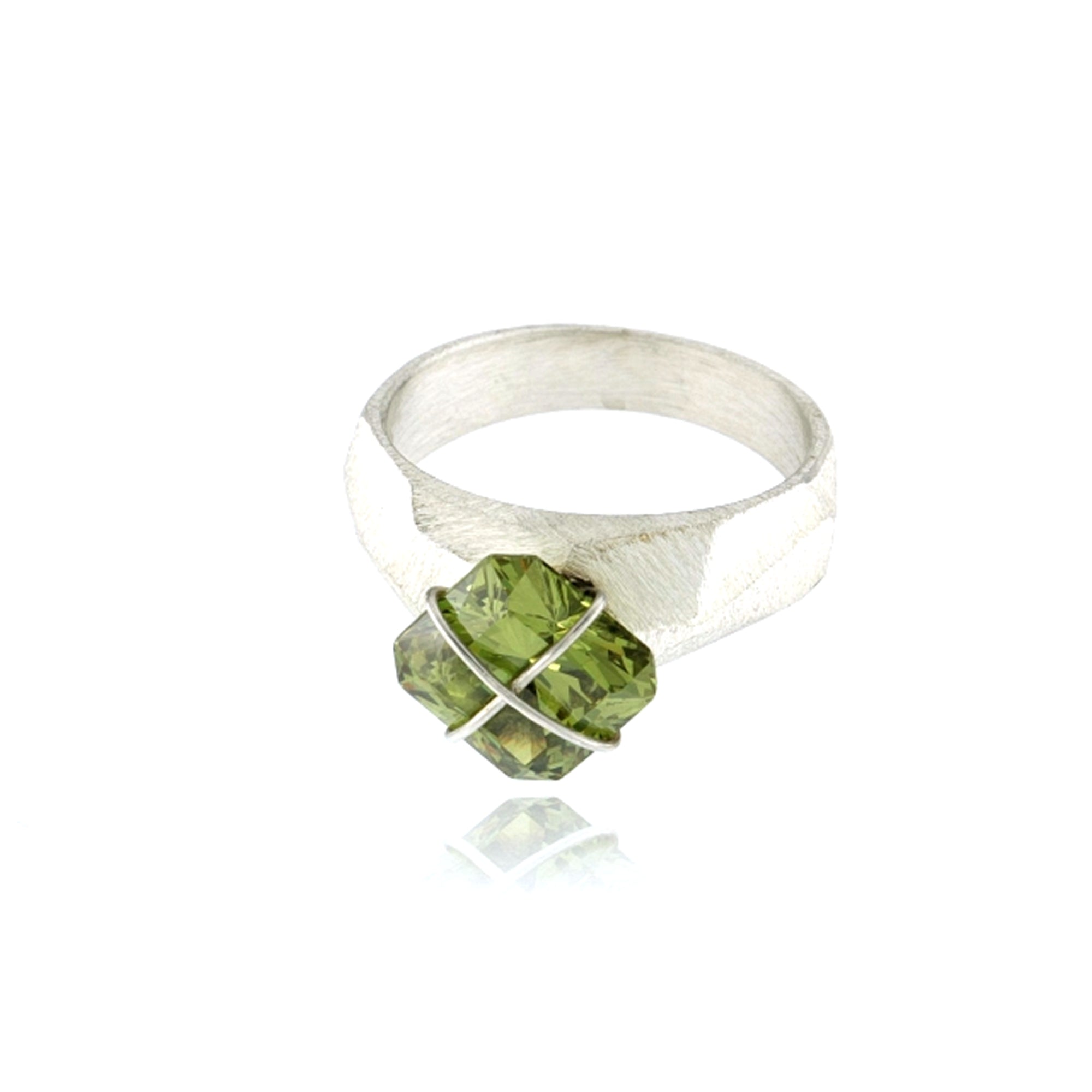 RING SILVER "PRESENT WRAP", FACETED FINISH 9x9mm PERIDOT CZ SET HIGH DIAGONALLY