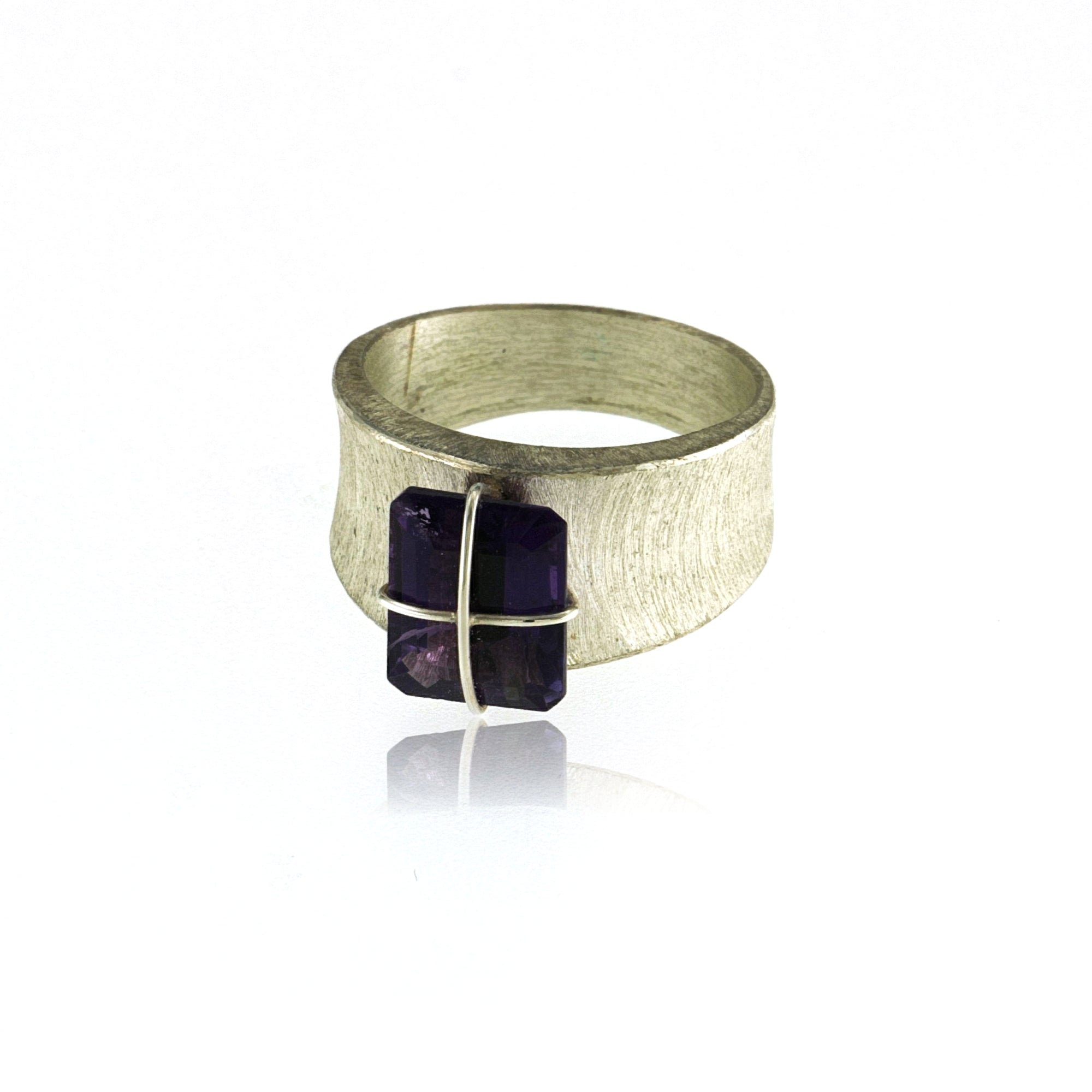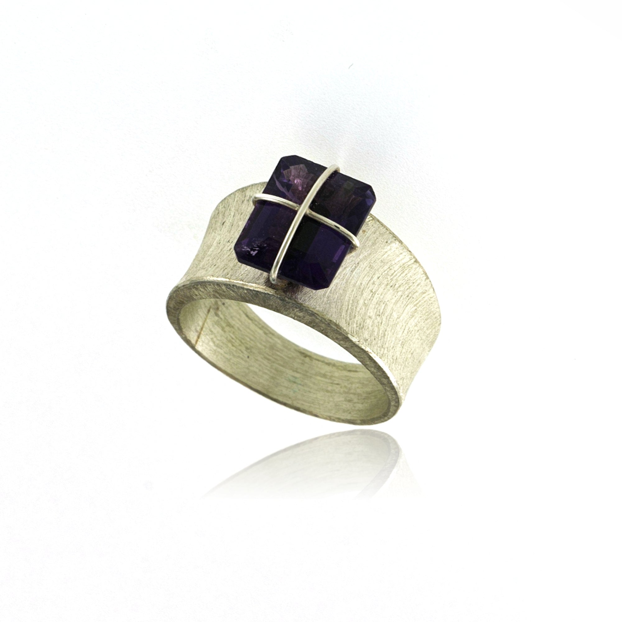 RING SILVER "PRESENT WRAP" ORIGINAL CONCAVE BAND, 10x8mm GENUINE AMETHYST